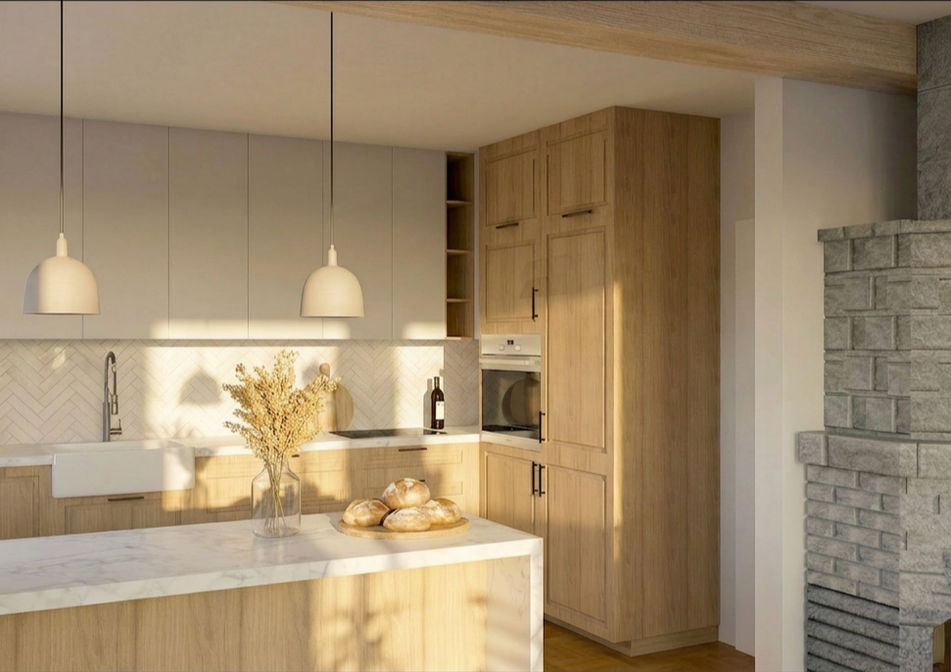 Helles Holz und weisser Stein in der Küche. Frisch, klar, unaufgeregt. Auch das Bad nimmt diese Farbwelt auf.